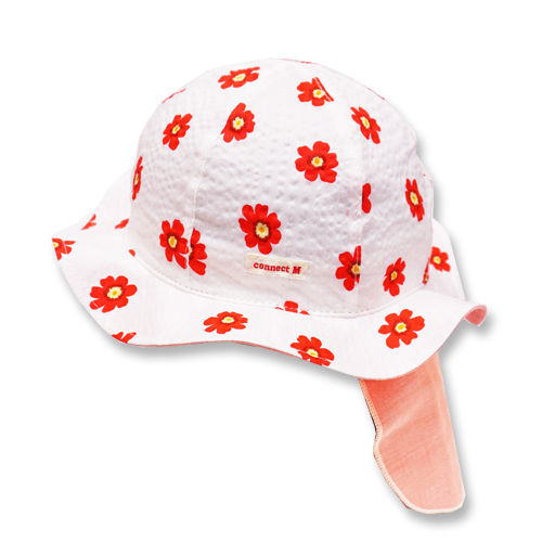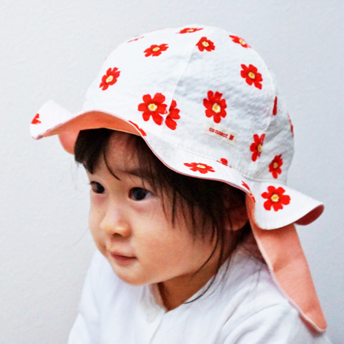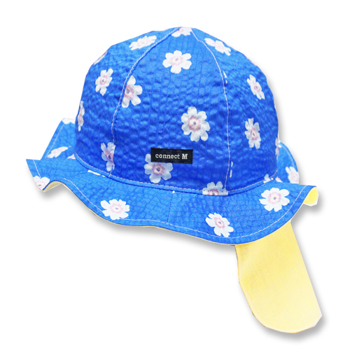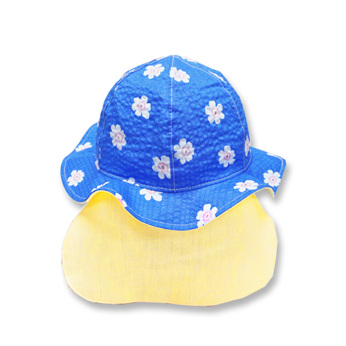 02-1007 日除け付ベビーガルボ 検索 02-1007 日除け付ベビーガルボ 花柄のリップル生地に無地のダンガリーの日除けが付いた、涼し気で紫外線からも守ってくれるベビーガルボ。 UVカット あごゴム付 日本製 品番02-1007 上代¥2,900 素材綿100%